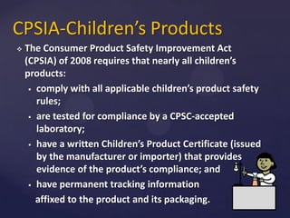 CPSIA Compliance (USA) - Compliance Gate CPSIA Tracking Label Durable Infant Products Small Parts Other Warning Labels CPSC Small Business Ombudsman Process Example What is CPSIA? CPSIA regulates all products sold to children aged 12 years or younger. It covers toys and other children's products. Such products include those that are generally considered to be children's products.