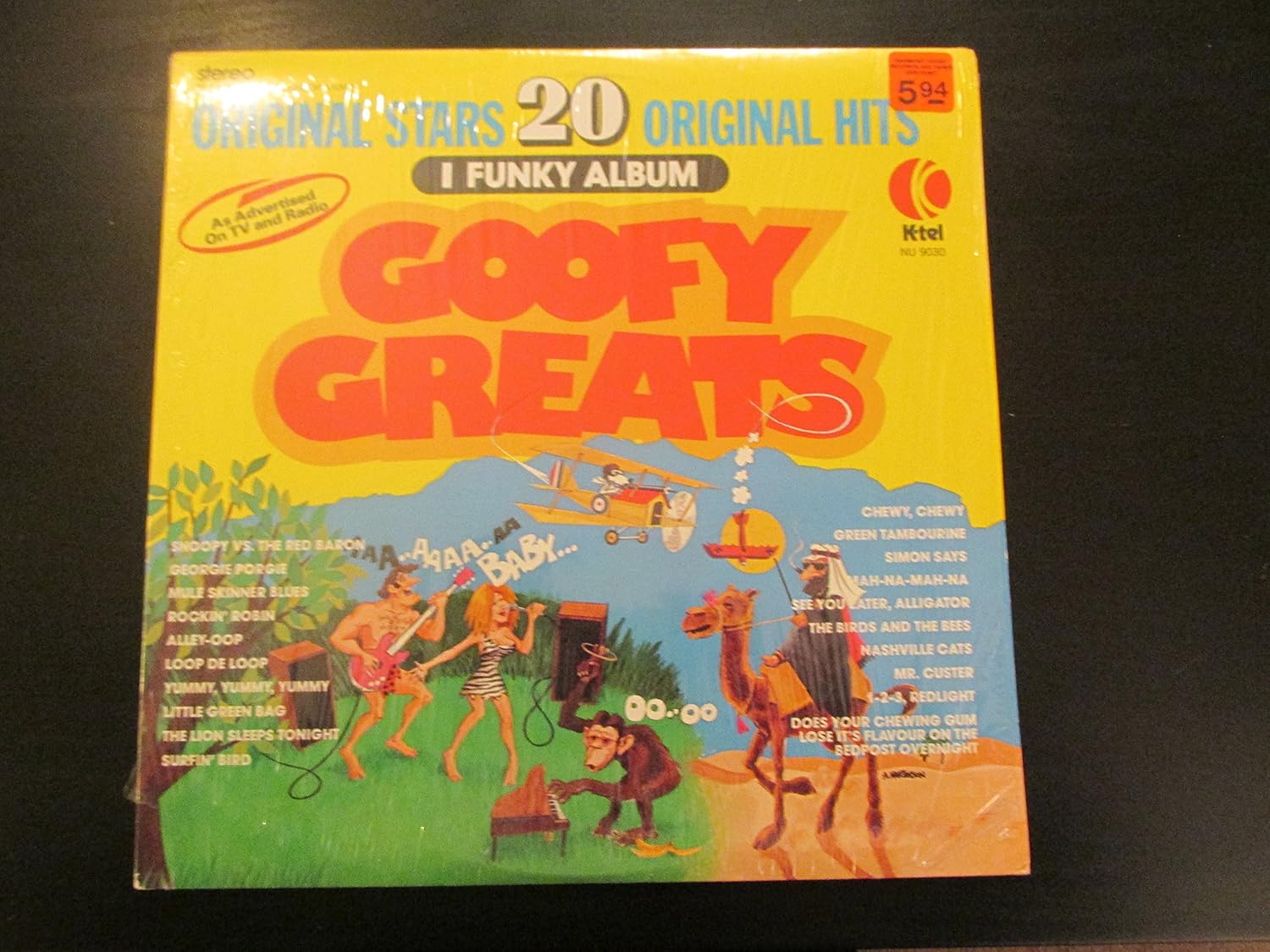 Goofy Greats (1975, 16 - Pitman Pressing, Vinyl) - Discogs K-tel Records "Goofy Greats" commercial. 0:59; Goofy Greats ( Snoopy Vs The Red Baron ) & A Box. 2:41; Goofy Greats ( AHAB The Arab ) 3:52; Goofy Greats ( The Lion Sleeps Tonight ) & A Box. ... Goofy Greats ( See You Later Alligator ) & A Box. 2:08; Jewel Akens - The Birds & The Bees. 1:57; Nashville Cats - Lovin' Spoonful. 2:38; 1,2,3, Red ...