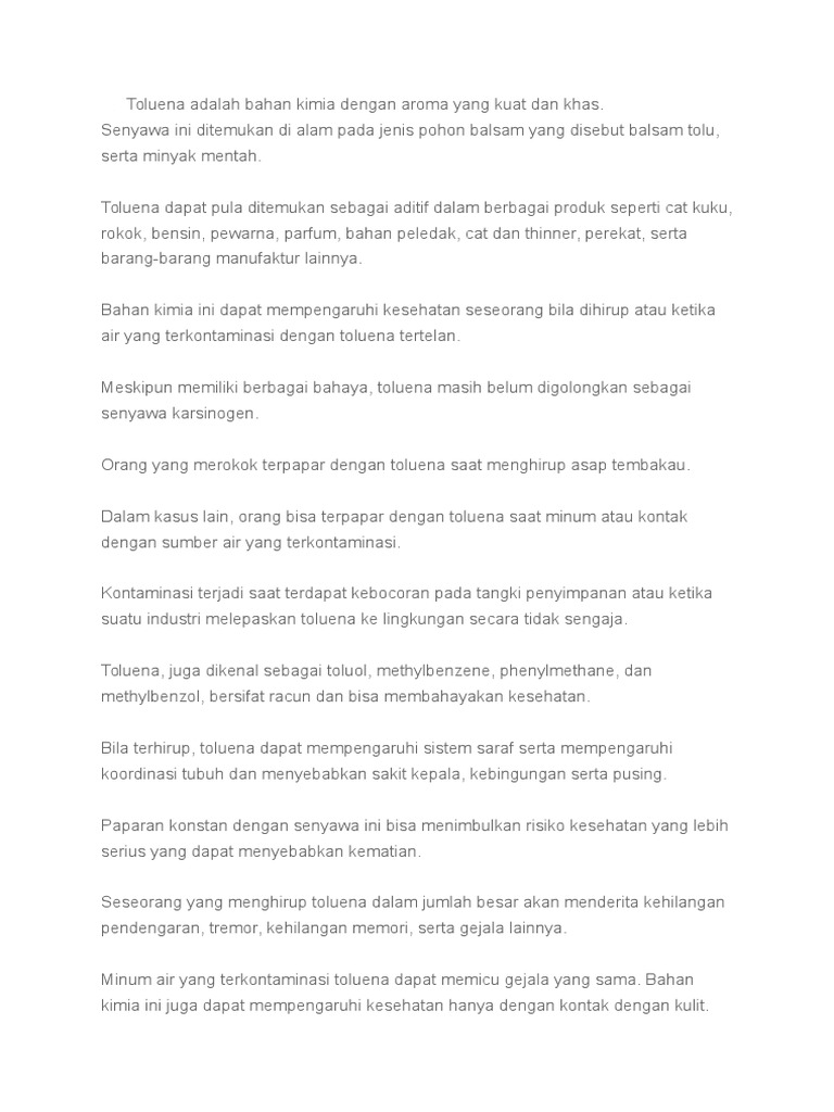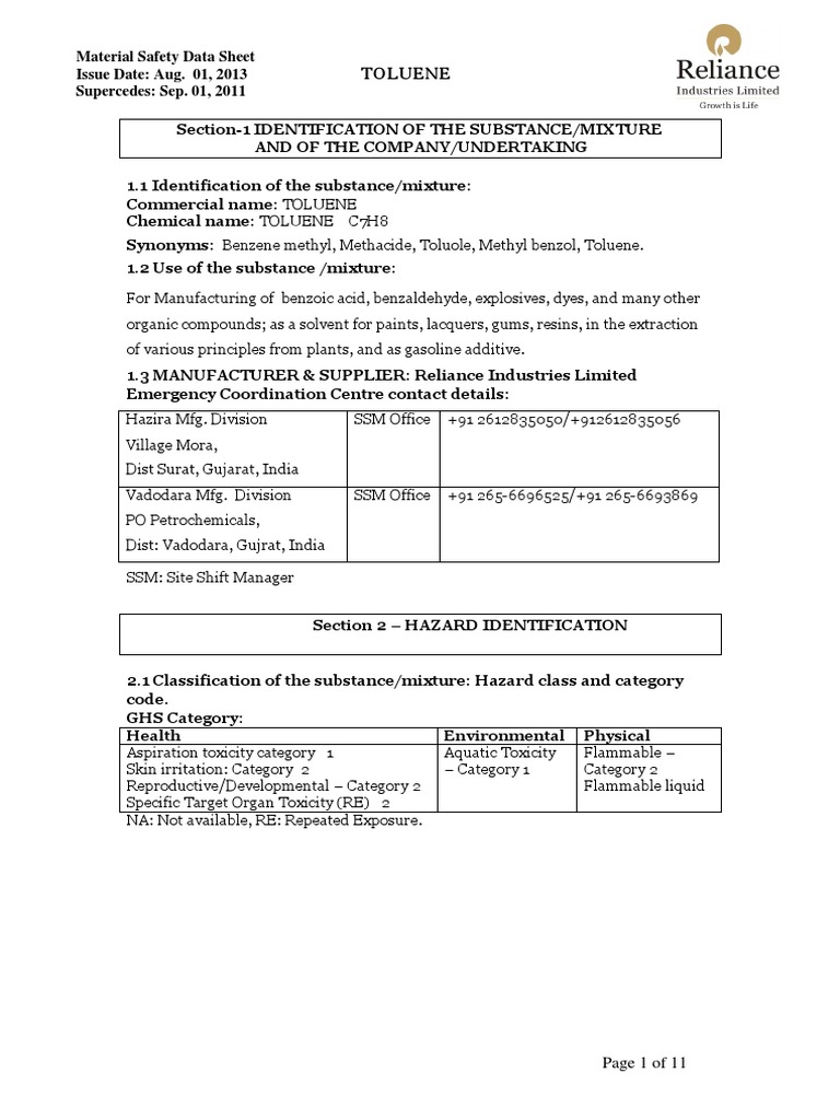 Toxicological Profile for Toluene - Page 171 - Google Books Result 2000 · ToluenePhysical and Chemical Properties of Toluene Property Information Reference Molecular weight 92.14 Weast 1989 Color Colorless NFPA 1994 Physical state Liquid ... Toluene - Wikipedia Toluene (/ ˈ t ɒ l. j u iː n /), also known as toluol (/ ˈ t ɒ l. j u. ɒ l,-ɔː l,-oʊ l /), is a substituted aromatic hydrocarbon.It is a colorless, water-insoluble liquid with the smell associated with paint thinners.It is a mono-substituted benzene derivative, consisting of a methyl group (CH 3) attached to a phenyl group.As such, its systematic IUPAC name is methylbenzene. PDF Safety Data Sheet Toluene, Reagent Grade lsECTION 1 : Identification of the substance/mixture and of the supplier Product name : Toluene, Reagent Grade ... NFPA/HMIS . j . Safety Data Sheet according to 29CFR1910/1200 and GHS Rev. 3 Effective date : 01.31.2015 Page 3 of 8 Toluene, Reagent Grade NFPA SCALE {0-4) Chemical - Toluene SDS Signs and Labels Toluene Signs and Labels Here you'll find safety signs, labels and pipe markers, as well as NFPA diamonds, GHS labels, PPE and other warnings for Toluene. Material options might include pipe markers, roll labels and stencils in addition to aluminum, plastic, magnetic backing and paper or vinyl labels. Most orders ship within 2 business days.