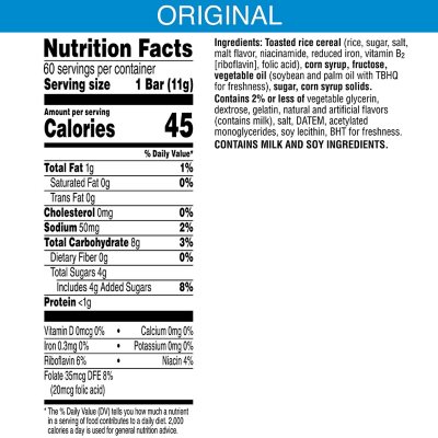 PDF Official US Nutrition Label Information Rice Krispies Treats Made with ... Contains 2% or less of vegetable glycerin, dextrose, salt, gelatin, natural and artificial flavors, DATEM, acetylated monoglycerides, reduced iron, vitamin B1 (thiamin hydrochloride), niacinamide, vitamin B6 (pyridoxine hydrochloride), folic acid, calcium pantothenate, soy lecithin, BHT for freshness. 190 45 Rice Krispies Ingredient Label / Disney Rice Krispie Treats Ingredients ... Rice krispie 0.78oz 22g wrapper template nutritional facts, sticker label, create your own design, psd, png, svg, dxf, ms word doc formats. This product is not certified organic read more · ewg food reports. Rice krispies treats whole grain chocolatey chip bar. Vitamin d · 8.4µg, (168), 2.5µg, (50). Easy Gluten-Free Rice Krispies Treats [4 Ingredients] Stir until they are completely melted. Add the gluten-free crispy rice cereal and vanilla extract, and quickly stir until the melted marshmallows are evenly mixed into the cereal. Using a buttered spatula or buttered hands, evenly press the mixture into the prepared pan. Cool completely. Cut into 2-inch squares.