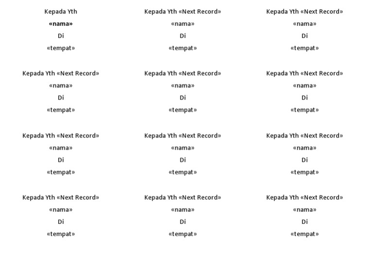 Download Format Label Undangan 121, 103 Word dan PSD, Bisa Diedit! Download Format Label Undangan 121 Word. Bagi kamu yang lebih familiar dengan ms word, tentu tidak salah jika memilih format doc. Apalagi jika file yang didapatkan bisa diedit, sehingga bisa langsung dipakai sesuai kebutuhan. Dengan memilikinya, maka kamu tak perlu repot membuat setiap kali membutuhkan format label undangan 121, maupun 103. Cara Membuat Label Undangan 103 di Microsoft Word Membuat template label undangan di Microsoft Word. Disini kita akan membuat template label undangan nomor 103. Template tersebut berfungsi untuk meyimpan text yang akan di cetak. Cara membuatnya adalah sebagai berikut. Langkah 1. Buka Ms word. Pada tab menu Mailings silahkan klik Start Mail Merge => pilih Labels. Template Label Undangan 103 [en5zkpxw15no] - idoc.pub Download & View Template Label Undangan 103 as PDF for free. More details. Words: 2,067; Pages: 28; Preview; Full text; Drs. Sunarno, M. Pd SDN 03 Pandeyan Karsiati, S. Pd SDN 03 Pandeyan Rita, A. Md SDN 03 Pandeyan Brenda SDN 03 Pandeyan Nurul SDN 03 Pandeyan Joko Susilo, S. Pd SDN 03 Pandeyan Download Format Label Undangan Nikah Ukuran 103 (Word) Format Label Nama Undangan. Label undangan ini sudah saya format dan sesuaikan dengan ukuran label undangan 103. Jadi kamu nggak perlu edit-edit ukuran lagi. Semuanya sudah pas. Kamu hanya perlu mengedit nama-namanya. Sudah saya sesuaikan supaya penulisan nama bisa di tengah. Fontnya juga sudah saya amankan.