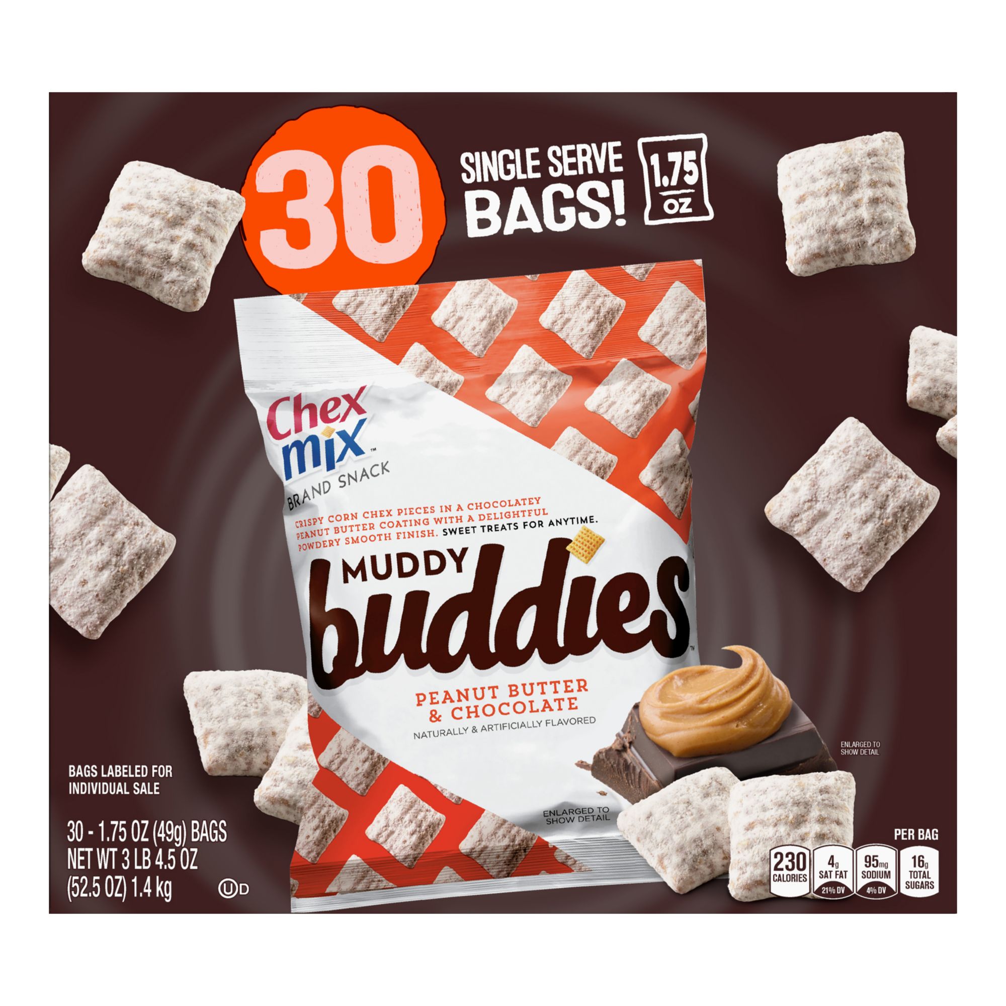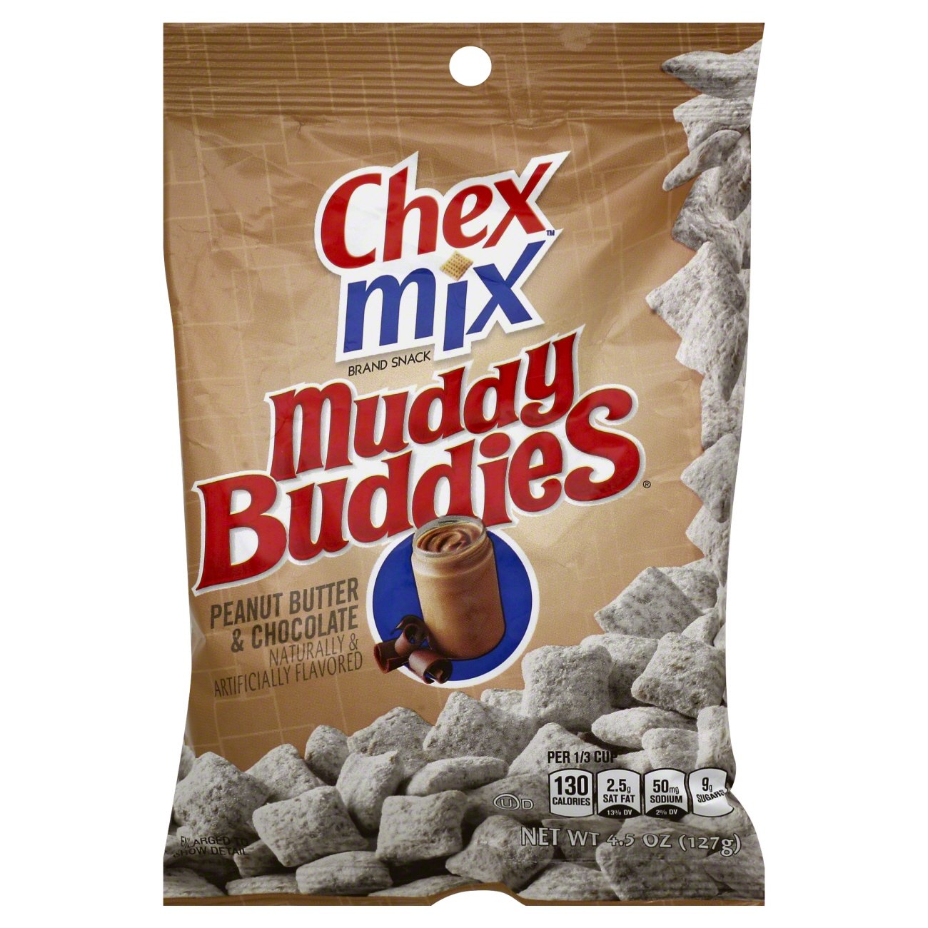 Calories in Puppy Chow - Calorie, Fat, Carb, Fiber, and Protein Info Calories per serving of Puppy Chow 53 calories of Wheat Chex Cereal, (0.25 cup (1 serving)) 37 calories of Powdered Sugar, (0.08 cup, unsifted) 33 calories of Butter, unsalted, (0.04 stick) 32 calories of Semisweet chocolate, (0.04 cup chips (6 oz package)) 30 calories of Peanut Butter, smooth style, with salt, (0.02 cup) Cereals ready-to-eat, General Mills, Chocolate Chex Amount of calories in Cereals ready-to-eat, General Mills, Chocolate Chex: Calories 131.8. Calories from Fat 24.2 ( 18.3 %) % Daily Value *. How much fat is in Cereals ready-to-eat, General Mills, Chocolate Chex? Amount of fat in Cereals ready-to-eat, General Mills, Chocolate Chex: Total Fat 2.7g. -. Calories in Chex Chocolate Cereal | CalorieKing How many calories in Chex Chocolate Cereal 173 Calories Quantity cup (1.5 oz) Serving Add To Compare 0/8 Nutrition Facts Calorie Burn Time How long would it take to burn off 173 Calories of Chex Chocolate Cereal? Swimming 14 minutes Jogging 20 minutes Cycling 27 minutes Walking 48 minutes Rich Chocolate Chex™ Mix Preparation. Line large rimmed baking pan with waxed paper. In small bowl, mix powdered sugar, malted milk powder and baking cocoa; set aside. In large microwavable bowl, add cereals. In small microwavable bowl, microwave butter uncovered on High 20 to 30 seconds or until melted. Stir in granulated sugar; microwave uncovered on High 30 to 60 ...