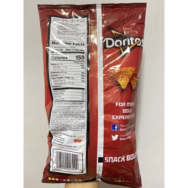Small bag of doritos nutrition facts. What Are Doritos Nutrition Facts? And Doritos nutrition facts small bag of 45 grams are 230 calories, 28g carbs, 12g fat, 1970g sodium, and 300g cholesterol. Doritos nutrition facts 100g are 496 kcal, 26g fat, 3.7g saturated fat, 58g carbohydrates, 2g sugar, 4g fiber, 7g proteins, and 1.8g sodium chloride. Doritos Chips Nutrition | livestrong Oct 23, 2019 · Doritos tortilla chips are a popular snack, but they are far from healthy. Doritos nutrition facts tell us these are high in fat and sodium, which isn't good. ... bag is the appropriate Doritos serving size. The serving size is about 12 chips. Frito-Lay Doritos nutrition facts for ... a small percentage of people may experience short-term ... Doritos Nacho Nutrition Facts • MyFoodDiary® Doritos Nacho Cheese Chips. 1 small bag (1 3/4 oz) Nutrition Facts. 260 calories. Log food. Doritos Spicy Nacho Chips. 12 chips (28g) Nutrition Facts. 140 calories. Amazon.com: Fritos Original Corn Chips, 1 Ounce (Pack of 50) Nutrition facts Product details. Brand: Frito-Lay: Flavor: Original: Weight: 50 Ounces: Number of Items: 1: Size: 1 Ounce (Pack of 50) ... Doritos Nacho Cheese Flavored Tortilla Chips, 1 oz (Pack of 40) ... the ingredients are mixed together in a small bag of Fritos Original Corn Chips instead of a dish. Don’t forget the spoon! Use a few of ...