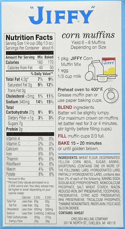 Jiffy Corn Muffin Mix: Calories, Nutrition Analysis & More - Fooducate Nutrition Serving Size: 1/2 cup mix (78g) Amount per Serving My Daily Value Calories 320 Kcal 19% Total Fat 9 g 14% Saturated Fat 4 g 24% Trans Fat 0 g 0% Cholesterol 10 mg 3% Sodium 690 mg 30% Potassium 90 mg 2% Total Carbohydrate 56 g 24% Dietary Fiber 2 g 8% Sugars 15 g 21% Added Sugars 15 g 62% Protein 4 g 8% Calcium 130 mg 13% Iron 1.8 mg 10%