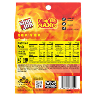 Giant Hot AF Spicy Meat Sticks | Slim Jim The name tells the whole story. When we say these spicy meat sticks are fire, we mean it literally. But in case you thought it was all pain and no gain, it's important to know it's also bold, savory, and brimming with brawny goodness. Tasty AF. Ingredients & nutrition. Slim Jim mini sticks Nutrition Facts & Calories - Inlivo KEY FACTS. Have high calorie density - this means that the amount of calories you are getting ... Slim Jim Nutrition Facts. Calories, carbs, fat, sodium & more ... Slim Jim Original Snack Stick Giant. 1 package (27.5g) Nutrition Facts. 130 calories. Log food. Slim Jim Original Snack Stick Short sticks. 4 packages (32g) Nutrition Facts. 150 calories. 0.28 oz Original Calories, Carbs & Nutrition Facts - MyFitnessPal Slim Jim 0.28 oz Original Serving Size: 1 stick 150 Cal 4% 2g Carbs 85% 20g Fat 11% 6g Protein Track macros, calories, and more with MyFitnessPal. Join for free! Daily Goals How does this food fit into your daily goals? Calorie Goal 1850 Cal 150/2000Cal left Fitness Goals: Heart Healthy Fat 47 g 20/67g left Sodium 1870 mg 430/2300mg left