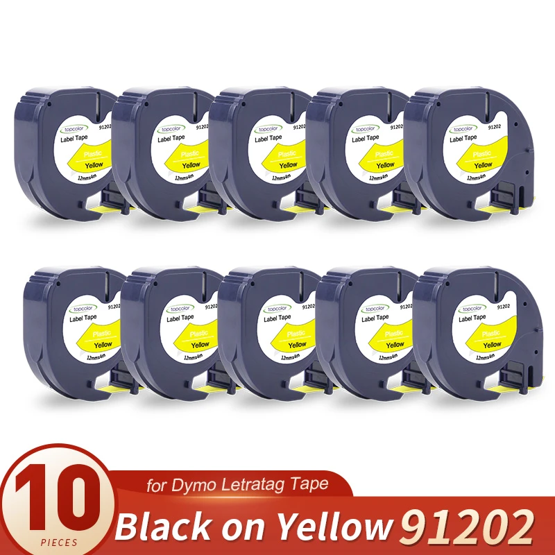 10PK Replace Dymo Letra Tag Cassette 12mm Dymo Letratag Ink 91202 Black on Yellow Refill Tape for Dymo Labeling Machine LT100H